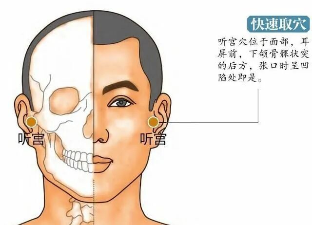 位于面部,耳屏前,下颌骨髁状突的后方,张口时呈凹陷处。缓解耳鸣耳聋