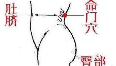 取穴:穴位于腰部,当后正中线上,第2腰椎棘突下凹陷中;与肚脐前后相对。如果以肚脐为标准围绕腰部画一个圆圈,在背后正中线的交点就是命门穴。