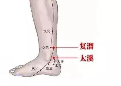 复溜穴,主要调理水液代谢失常,肾经母穴。