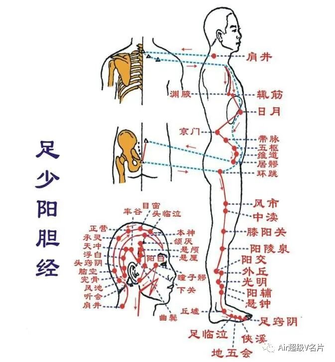 胆经起于外眼角的童子穴,止于脚上的足窍阴穴,主要经过肝、胆、心等臟腑,这三个臟腑的毛病,以及胆经循行经过地方的问题可以找胆经上的穴位调理。
