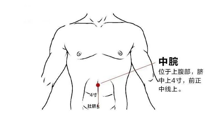 中脘穴位于肚脐与胸骨连线下端的中点,调理此穴能补充胃中阳气,促进胃动力,改善消化功能。