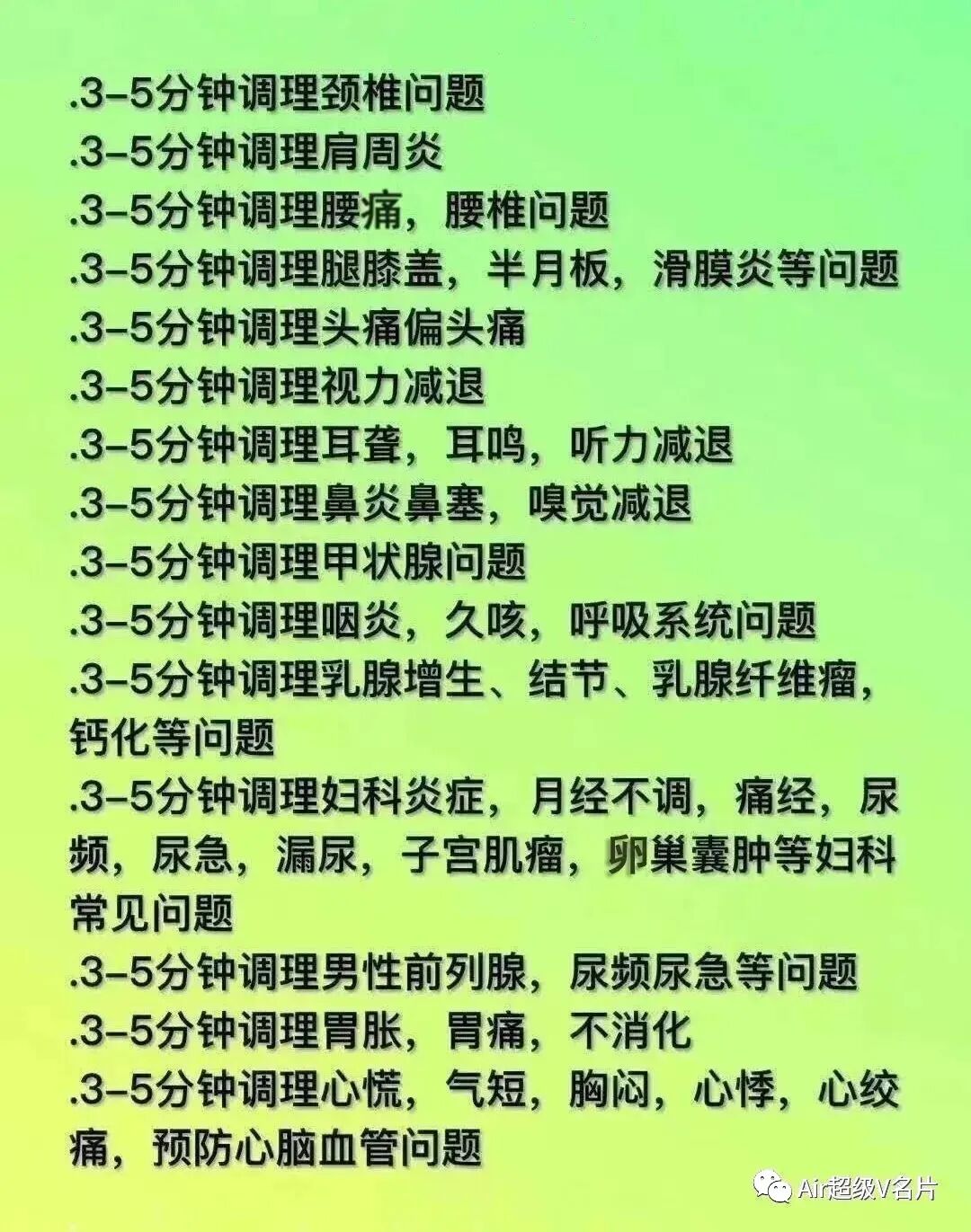 瘫痪、腰酸背痛、腰肌劳损、痛经、子宫肌瘤、卵巢囊肿、不孕不育、腰椎间盘突出、更年期综合征、内分泌失调等。