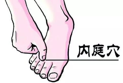 内庭穴:第二脚趾与第三脚趾之间的趾蹼缘。