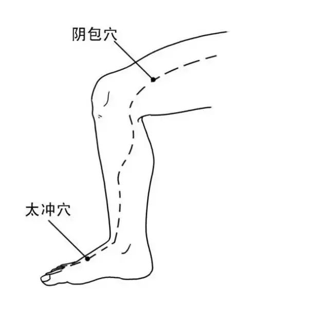 阴包穴:大腿内侧中线上,膝关节上一掌宽处。