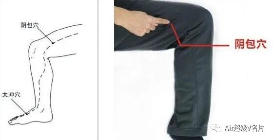 肝经还有一个堵塞点,在膝盖上方大概一掌宽的地方:阴包穴。如果经气堵在这个地方,下面的气就传不过来,这时要先疏通阴包穴。
