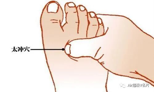 太冲穴是肝经的一个出口,是肝经的原穴,在脚面最高点,下面是大脚趾和二脚趾分叉的地方,用同侧手的食指指腹,抵在凹陷处,把发力点作用在骨头上,轻轻点揉。