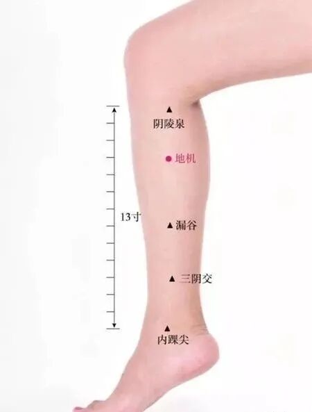 地机穴定位:阴陵泉与内踝高点的连线上,阴陵泉下3寸。