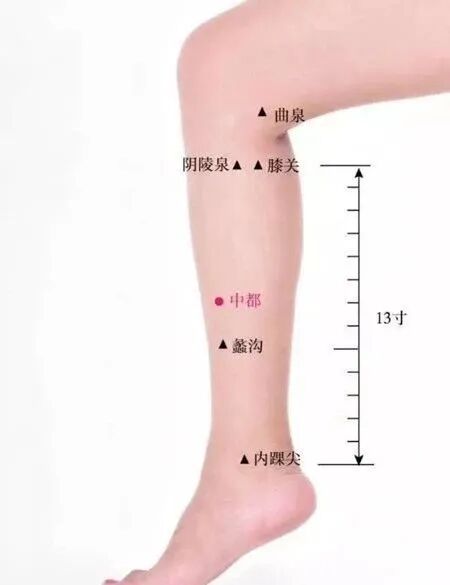 中都穴定位:内踝高点直上7寸,胫骨内侧面的中央。