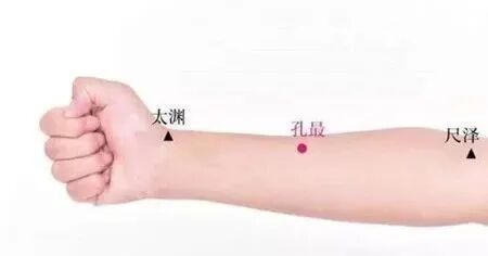 孔最穴定位:前臂掌侧,当尺泽穴与太渊穴连线上,腕横纹上七寸处。