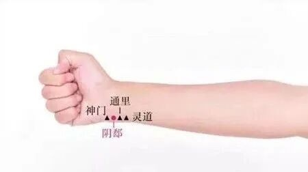 阴郄穴定位:伸肘仰掌,用力握拳,在手前臂内侧可触摸到一条大筋(尺侧腕屈肌腱),从腕横纹沿此肌腱的外侧向上半横指,拇指指甲中点所对,按压有酸胀感处。