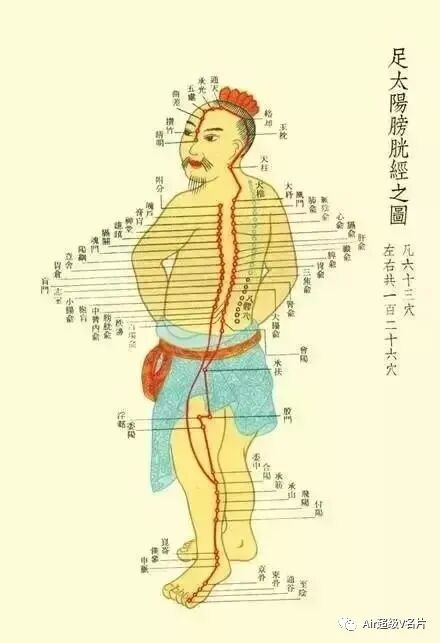 膀胱经的走向是从头开始的,然后沿着头后边一直到脚外侧小趾边缘的至阴穴。