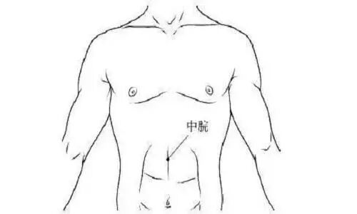 中脘穴位于上腹部,胸骨下端和肚脐连接线中点(当脐中上4寸)。