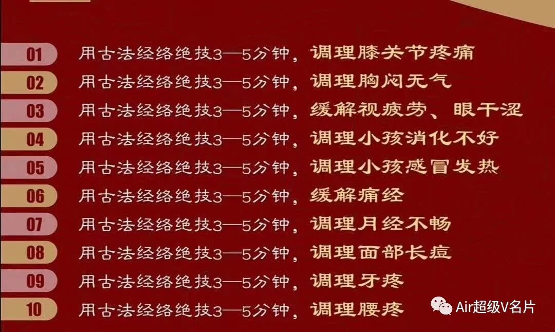 因为古法经络大讲堂传承中医文化,为全民大健康助力,学习古法经络的 你可以收获以下常见问题的调理方法: