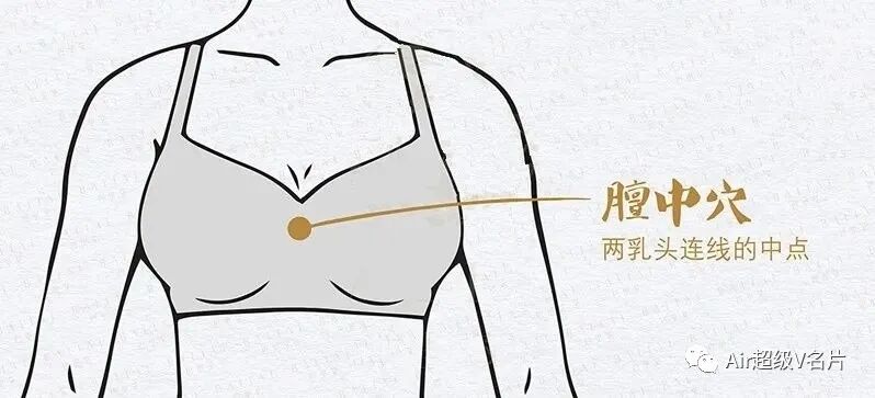 是心包经的募穴,在胸部,两乳头连线的中点。具有宽胸,宁心安神的作用。主要用于呼吸系统及血液循环方面的问题,可以改善胸闷胸郁、心悸、咳嗽、气喘、慢性支气管炎、焦躁等症状。乳汁分泌不足也可常按压膻中穴。