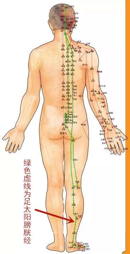 足太阳膀胱经自内眼角(睛明)起始,上向额部(神庭),在头顶与督脉相会(百会)。它的分支,从头顶到耳上角。它直行的主干,从头顶入颅,联系脑,回出来从后项部左右分开向下,一支沿着肩胛内侧,脊柱两旁,到达腰部,由此深入,沿脊柱两侧的肌肉,联络肾脏,属于膀胱。它在腰部的分支,从腰部夹脊继续下行,通过臀部,进入膝腘窝中(委中)。它的另一条支脉,从后项向下,自肩胛内缘,直至肩胛下面,夹着脊柱向下,经过髋关节,沿着大腿后面下行,在腘窝中与前支经脉会合。由此合而下行,通过腓肠肌内,出外踝后方,沿第五跖骨粗隆(京骨)到足小趾外侧末端(至阴)。脉气由此与足少阴肾经相接。