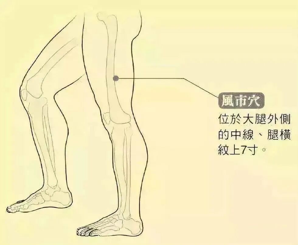 大腿的外侧,和阴包穴对称的,是胆经的风市穴,也是特别容易堵塞的。