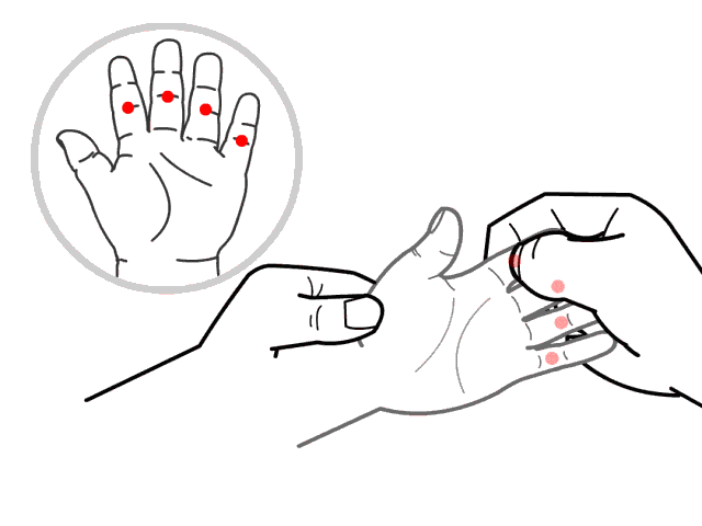 位置:掌面,食、中、无名、小指第一指间横纹,掐揉四横纹,从食指纹起每捻揉3~5次,以拇指甲掐1次,依次捻掐完四指为一遍,操作10次,多用于调理小儿食积积滞、厌食等问题