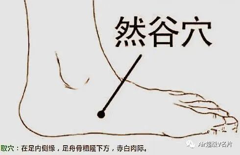 位置:它在足内侧,先找到足内踝尖,在其前下方可以摸到一块隆起的骨头,这个粗隆的下方就是然谷穴了。