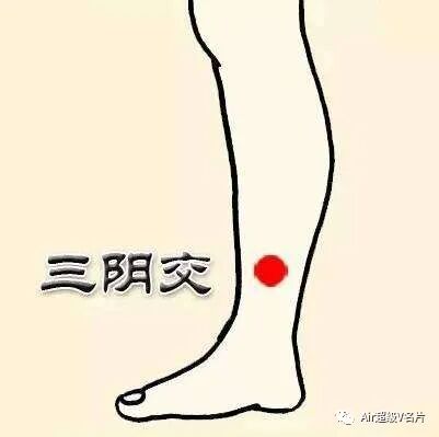 三阴交穴按摩法:坐起来,竖起右腿,用右手拇指按摩右腿三阴交点,逐渐按压,按摩7秒,慢慢减压松开。重复15次后,左拇指改为左腿三阴交点按摩。