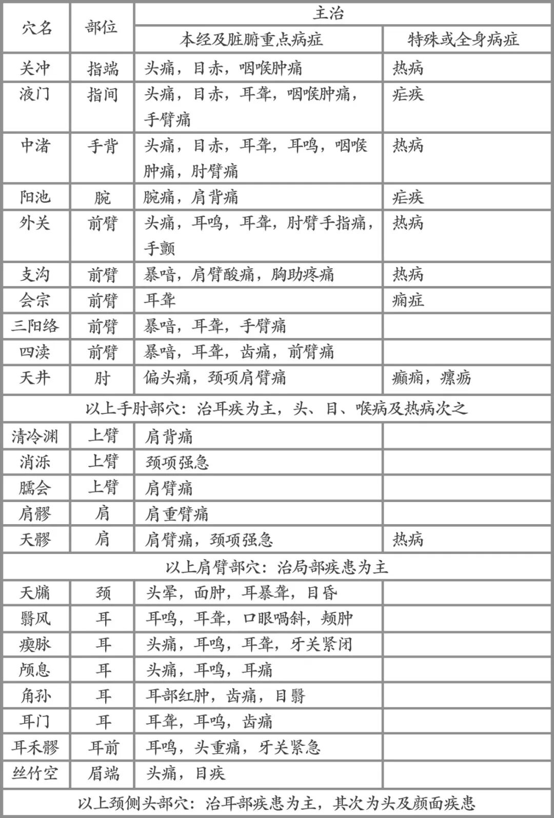 为了方便大家系统记忆三焦经的23个经穴和相应的主治,我们把手少阳三焦经经穴歌和腧穴主治提要表列一下,供有兴趣的朋友参考、学习。