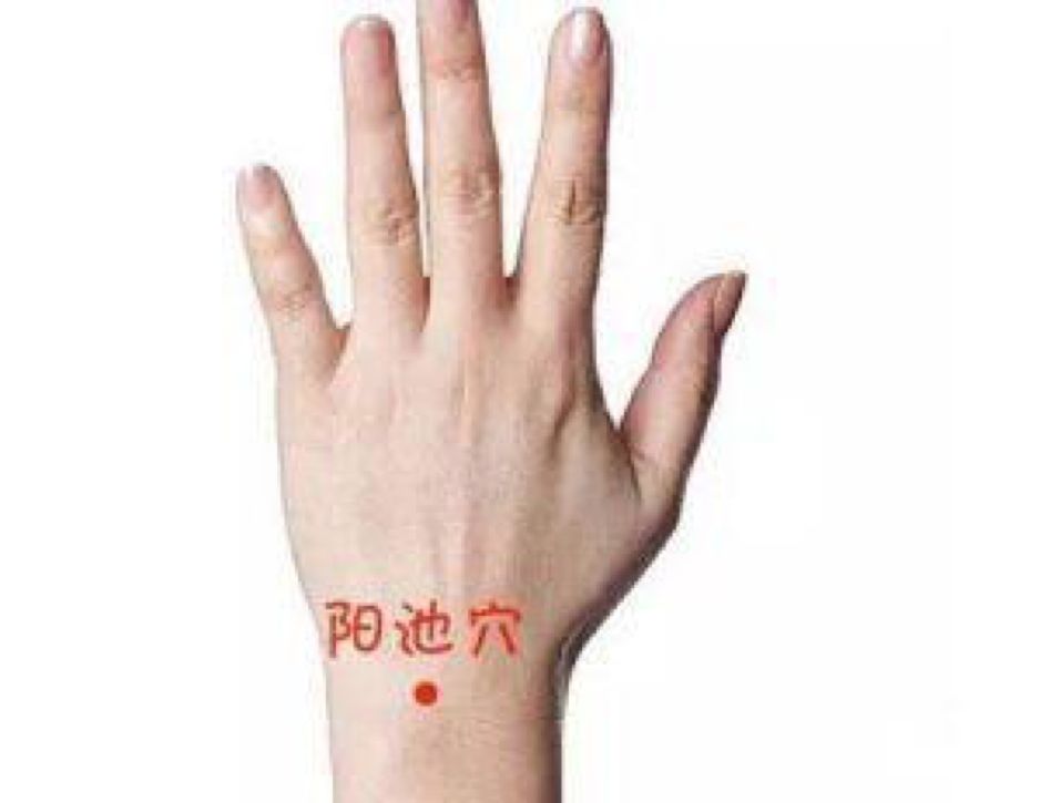 阳池穴位于手腕部位,腕背横纹中,当指伸肌腱的尺侧缘凹陷处(即腕背横纹上,前对中指、无名指指缝)。