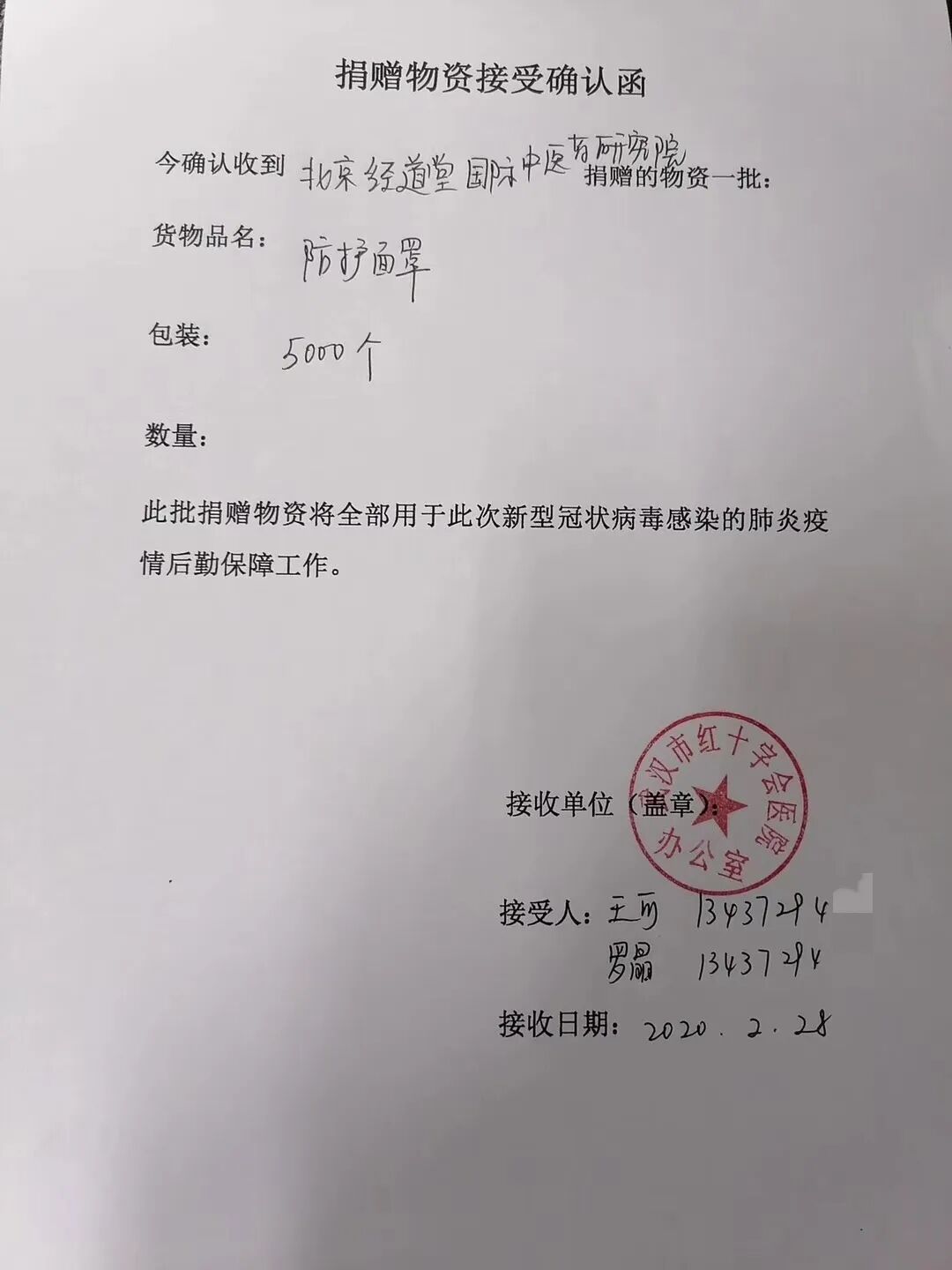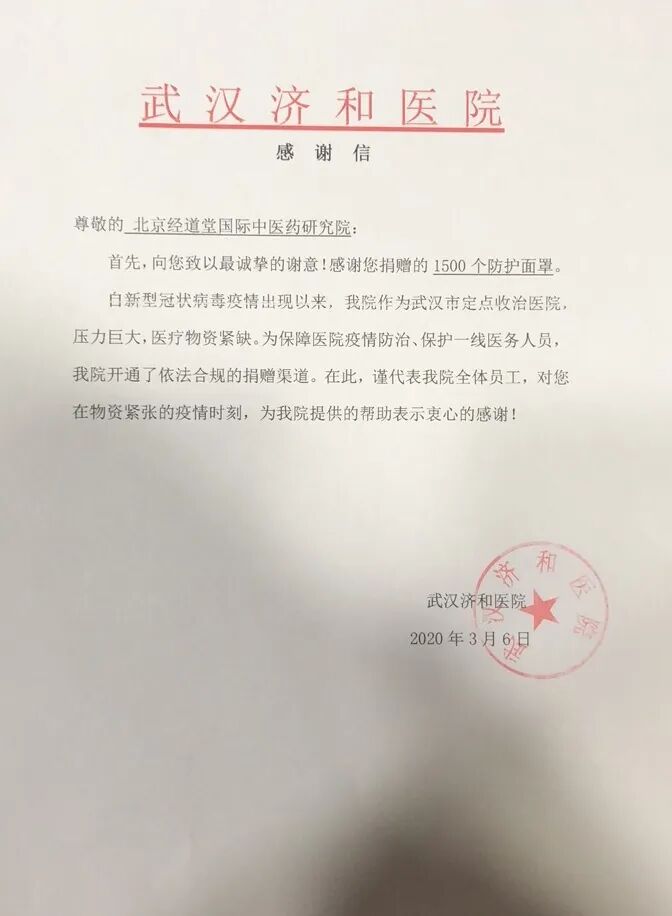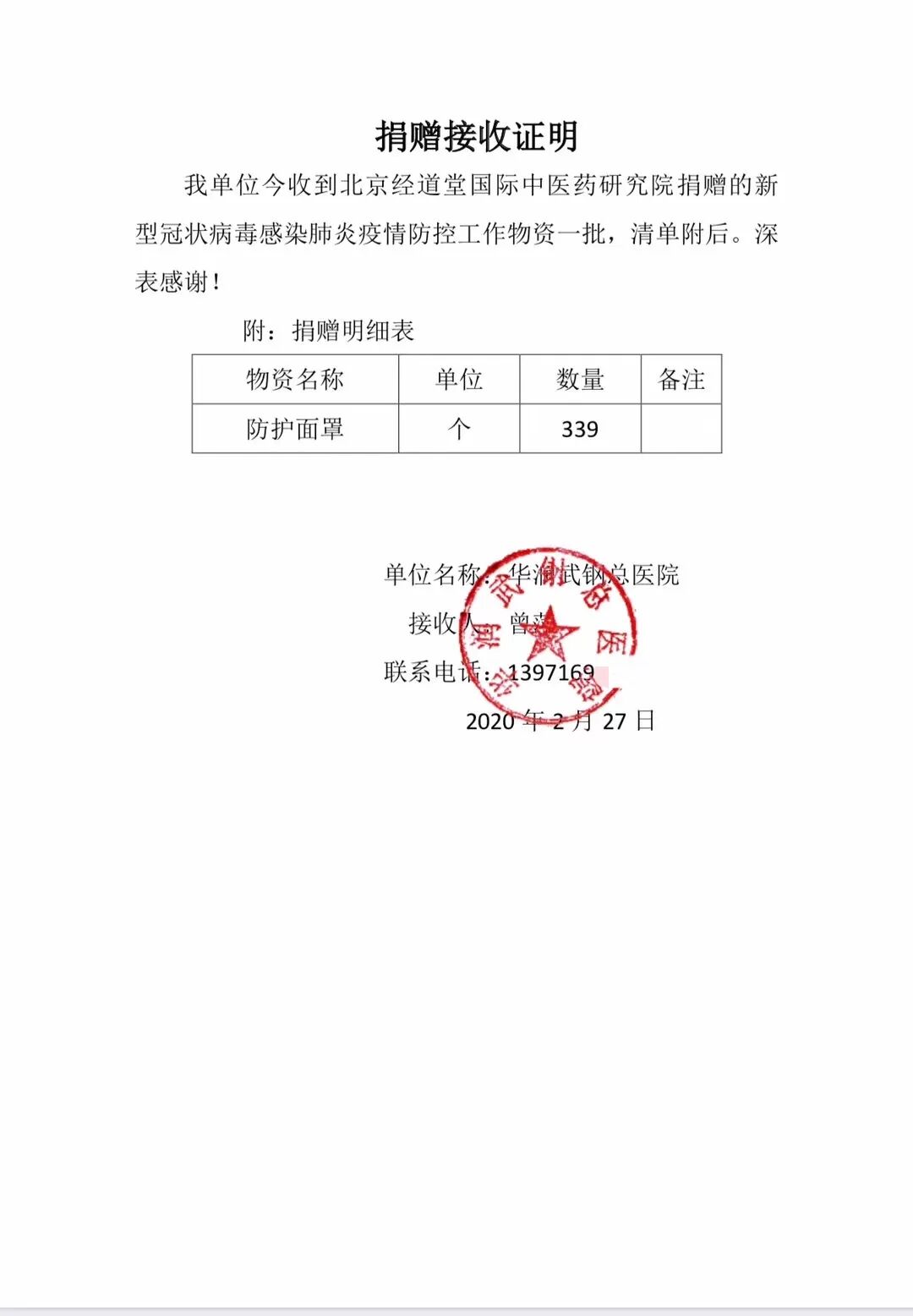 疫情不停,爱心不止,未来北京经道堂国际中医药研究院所捐赠的物资还会陆续抵达受捐医院,我们与一线医护工作者同在!