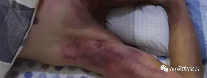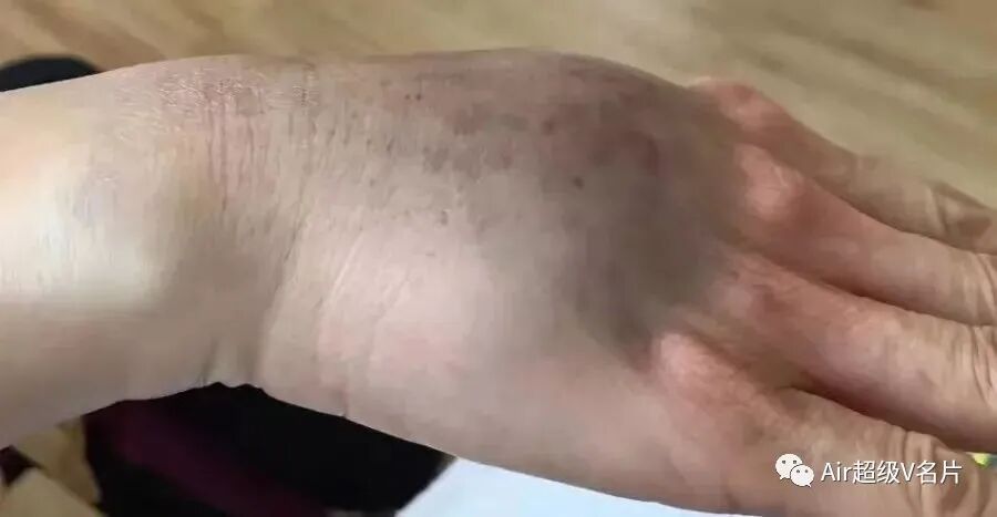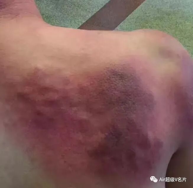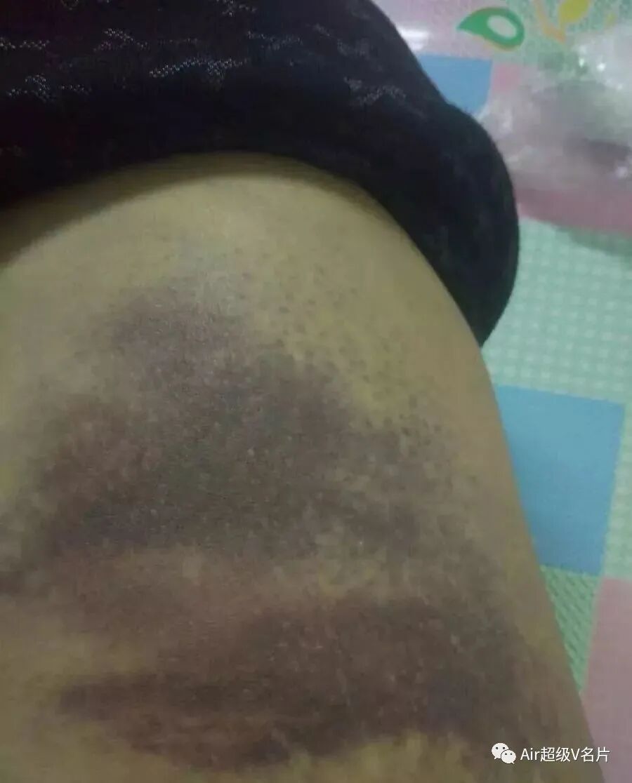 10)【墨汁黑痧】:毒素瘀滞时间长,陈年旧疾病较重,寒湿疼痛已经深入骨骼,这种黑痧常见于两边胯骨和腿根部,痧退后需要再反复拍打多次才能慢慢清除干净。
