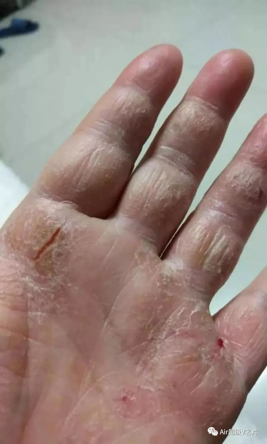 13)【裂口】:这种拍出硬皮,直接裂口的常见于手脚有各种皮炎的,并且擦各种激素膏药较多的,比如神经性皮炎,接触性皮炎等,擦的激素药膏沉积在皮肤深层,拍打后会通过指端末梢代谢出来。