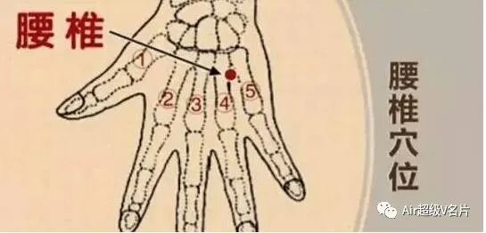 人体运动系统的主要手诊位置在手背上,只有一小部分在手掌中表现。脊柱的手诊部位是自手背中指根部到腕部的连线,下1/4为腰椎。