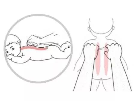 3、食指半屈,用双手食指中节靠拇指的侧面,抵在孩子的尾骨处;大拇指与食指相对,向上捏起皮肤,同时向上捻动。两手交替,沿脊柱两侧自长强穴(肛门后上3~5厘米处)向上边推边捏边放,一直推到大椎穴(颈后平肩的骨突部位),算做捏脊一遍。