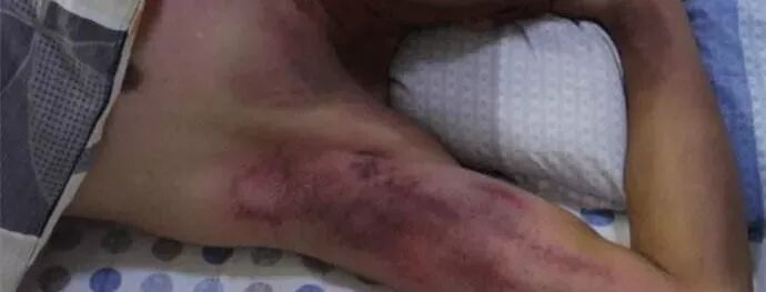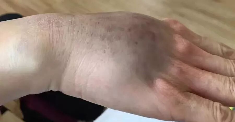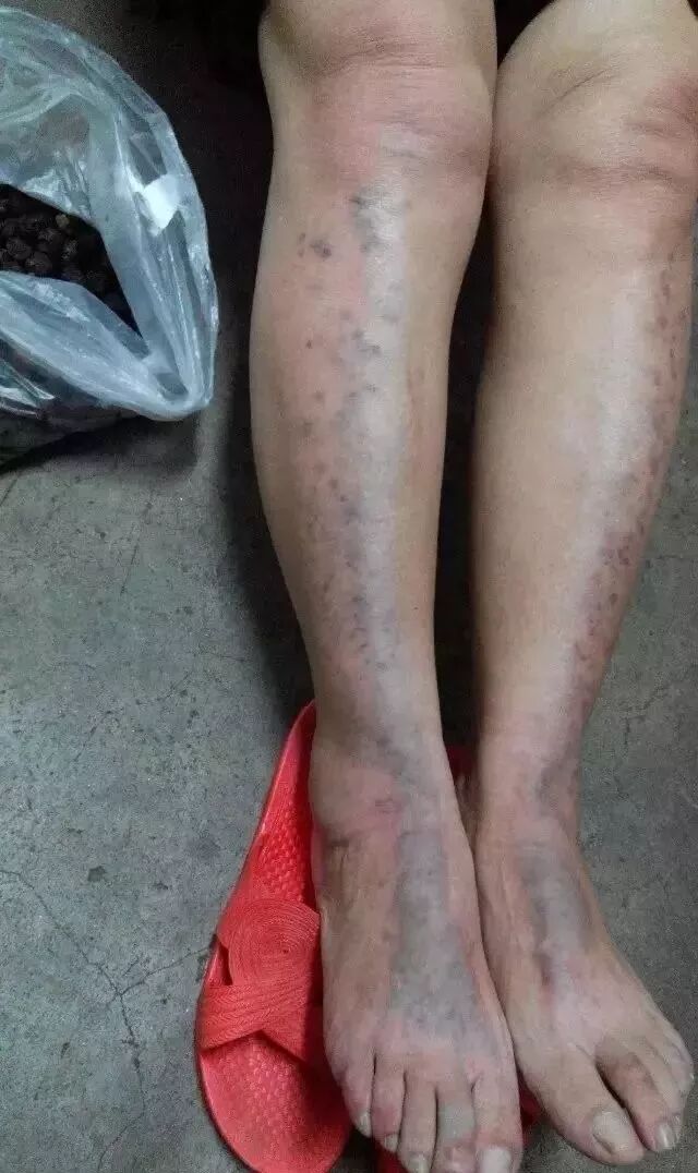 10)【墨汁黑痧】:毒素瘀滞时间长,陈年旧疾病较重,寒湿疼痛已经深入骨骼,这种黑痧常见于两边胯骨和腿根部,痧退后需要再反复拍打多次才能慢慢清除干净。