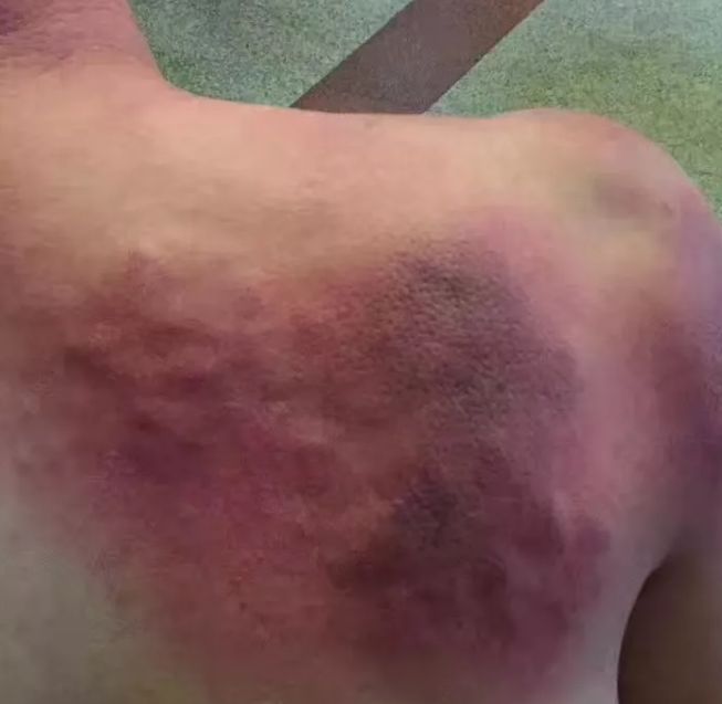 12)【沿整条经络出痧】:当一整条经络都堵的厉害时,顺着拍下去,会直接按经络走向出一长条的痧包块,就像一副清晰的人体经络图。