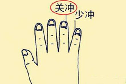 关冲穴像一个气筒,就是放气的地方,心里憋闷,平常就多揉揉关冲穴。尤其心烦意乱,却又说不出哪儿难受,感觉就是不舒服,就可以揉揉这里。按完之后打几个嗝、放几个屁,气血马上就通畅了。