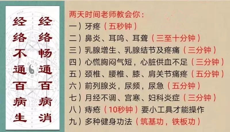 近30余种病的调理方法,现场调理,现场教学,老师一对一指导,教到你会为止,不玩虚的,不打针不吃药。