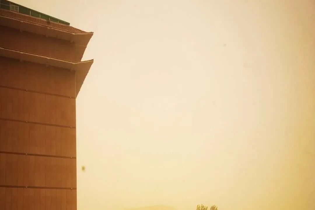 幸运的是,沙尘暴这种极特殊天气,平日里根本遇不到。几乎就是眨眼间,整个城市便被黄沙一口吞下,只剩太阳在灰黄的天上挣扎。说它不幸,是因为沙尘暴导致很多人期待的景区之行被迫停止,多位队员飞机延误、取消,甚至连出征大典都没有赶上。