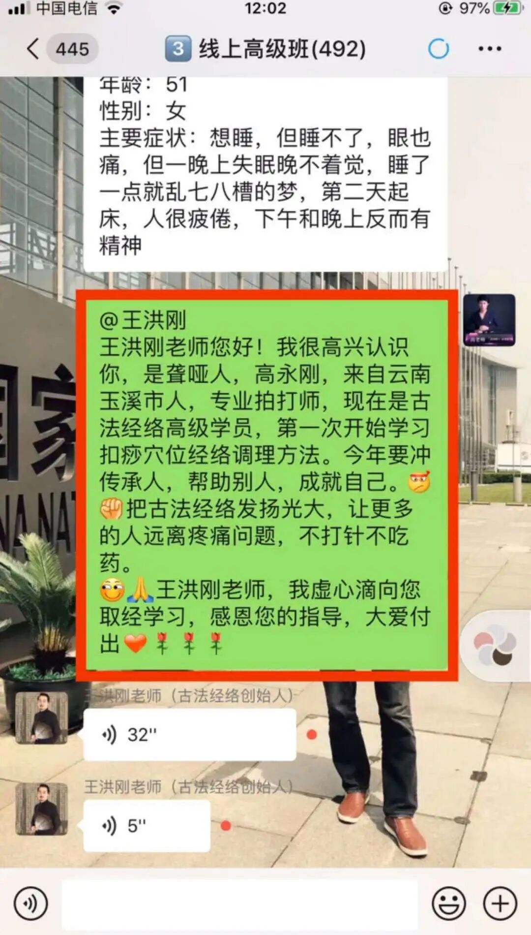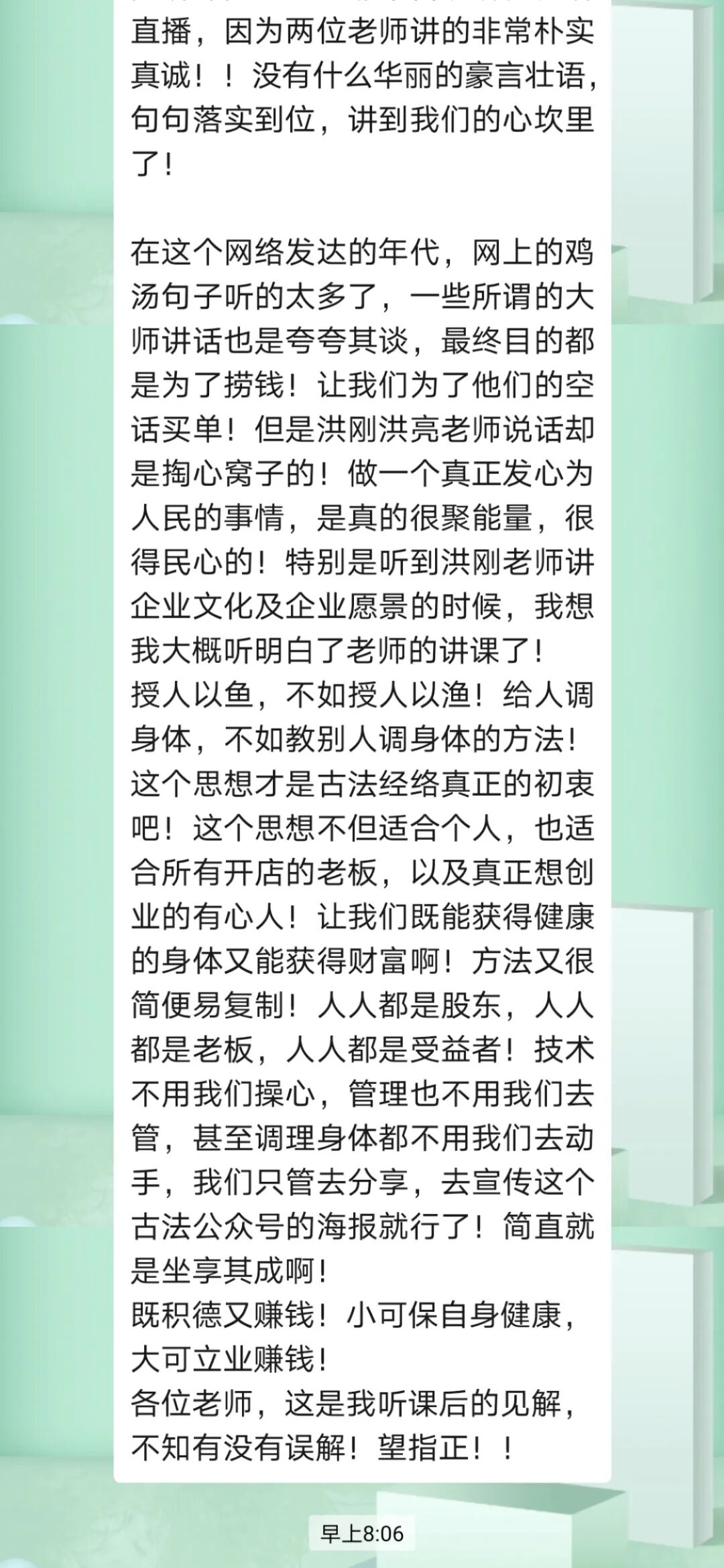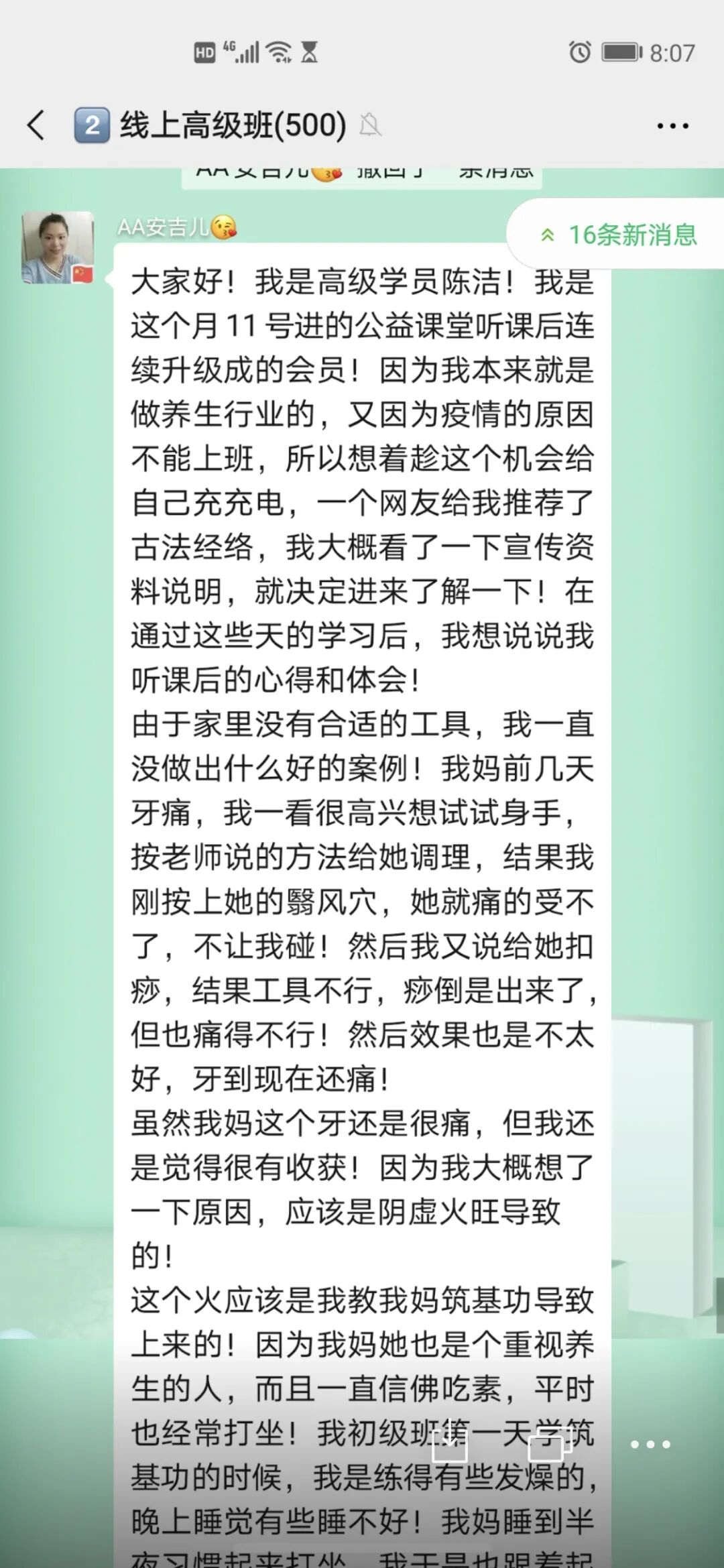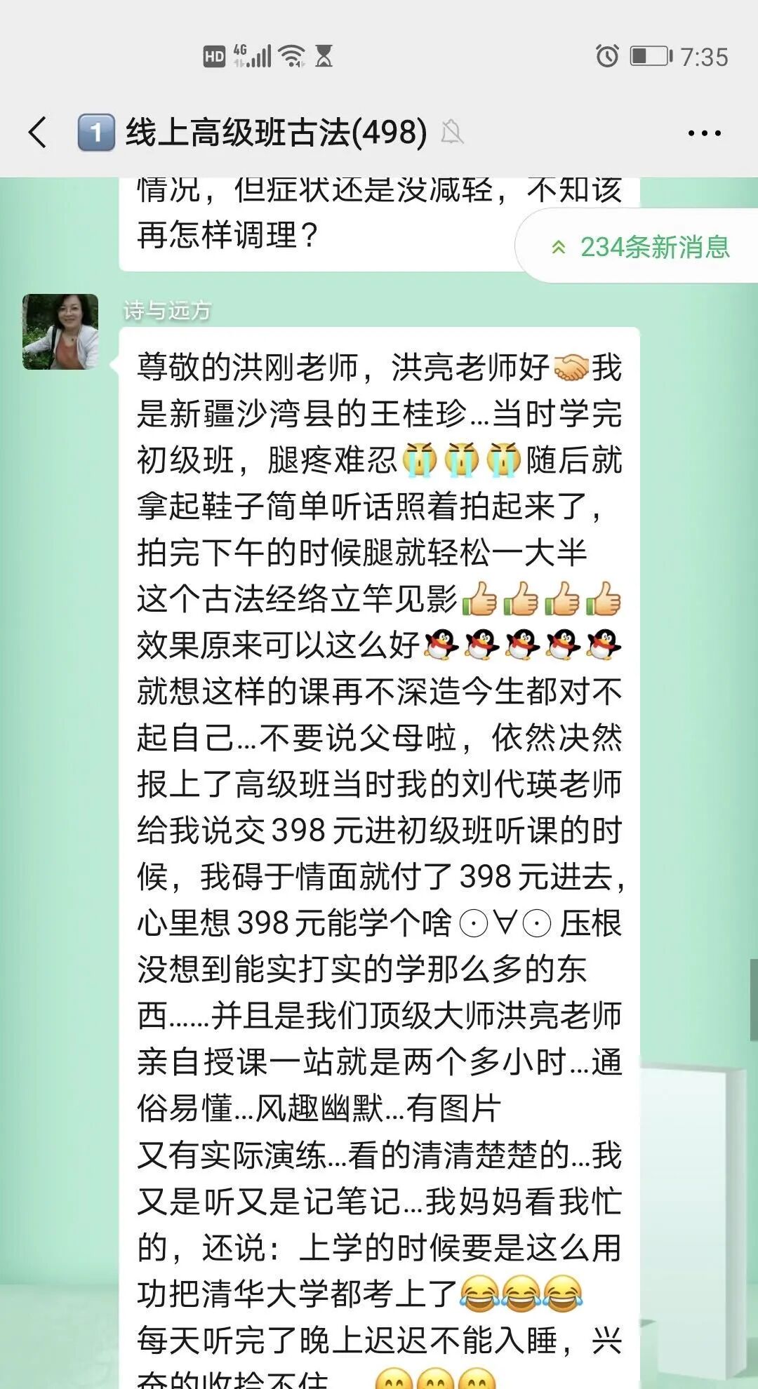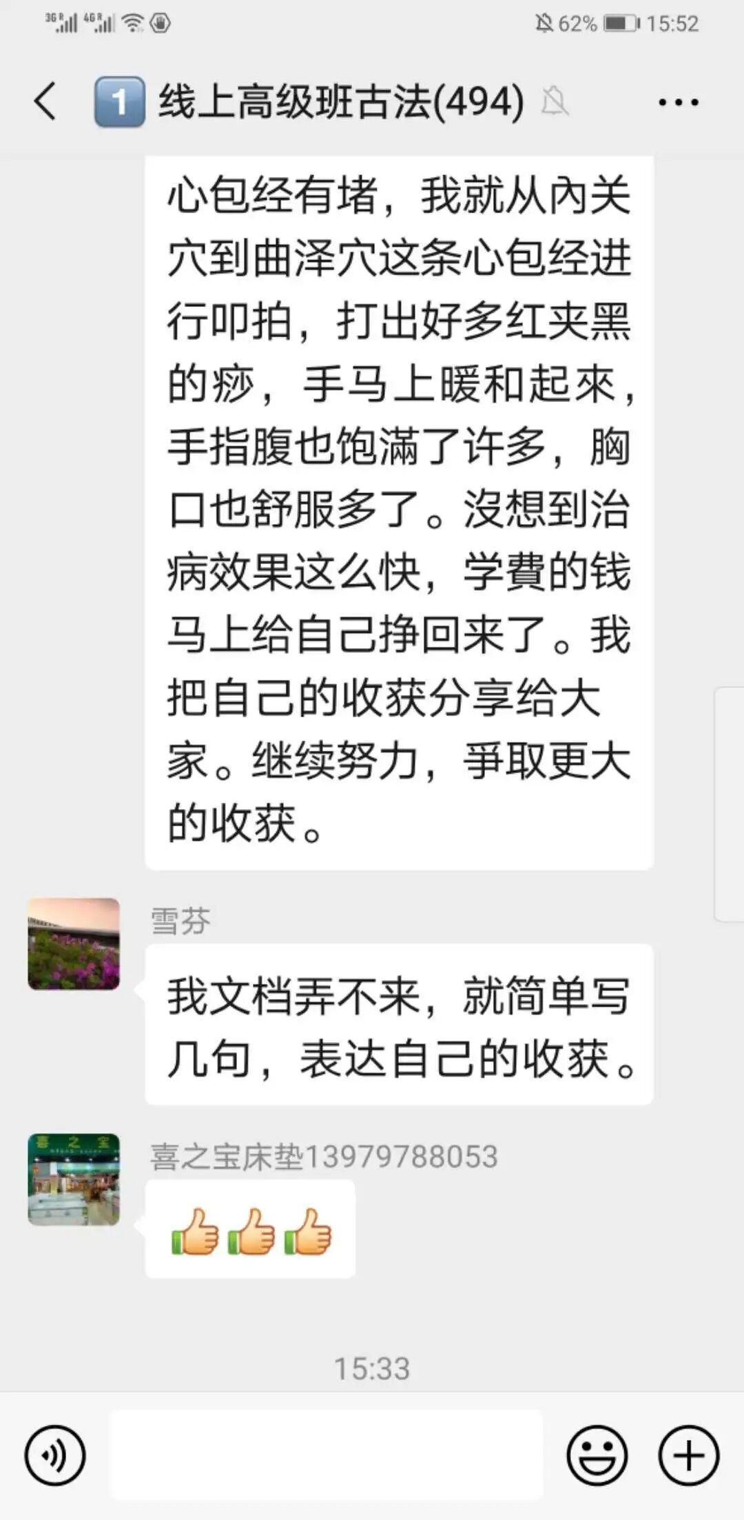随着课程的推进,许多学员在学习与实操中自身的健康问题得到了改善,纷纷在群里分享了自己因古法经络受益的激动心情,也让大家再一次见证了古法经络技艺的行之有效。