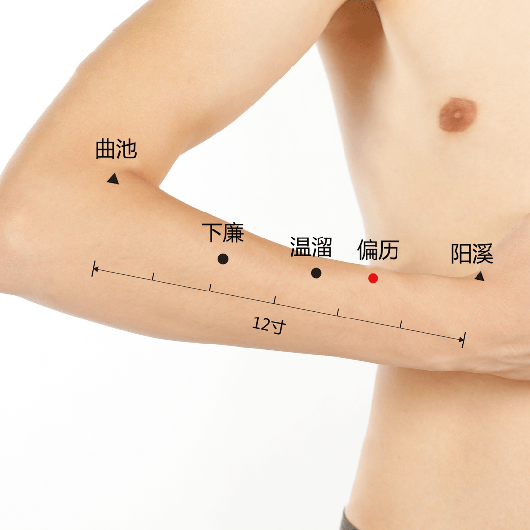 位置:两手虎口相交,中指在手臂上所点处就是偏历穴。它有两大功能,其一是治疗和预防面部神经麻痹和预防脑中风;其二是利水消肿。平常有前列腺、泌尿系统感染的人,一定要坚持揉这个穴,要拨动着揉,揉时会发现有好多硬的乱筋在里面,把它们揉松揉散就好了。