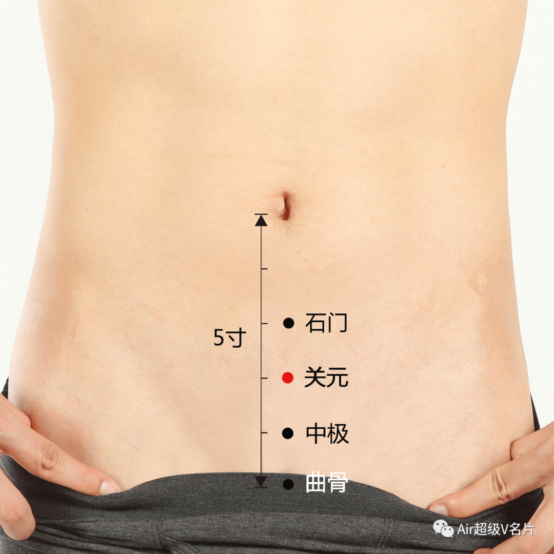 关元穴的位置:肚脐以下3寸(约为除拇指外四根手指并拢的宽度)处。