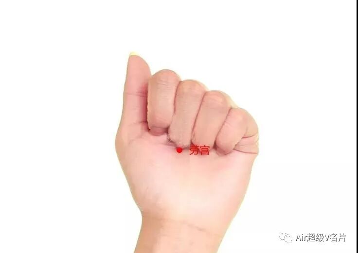 劳宫穴在手掌心,当第2、3掌骨之间偏于第3掌骨,握拳屈指时中指尖处。(此穴为双穴,左右各一)