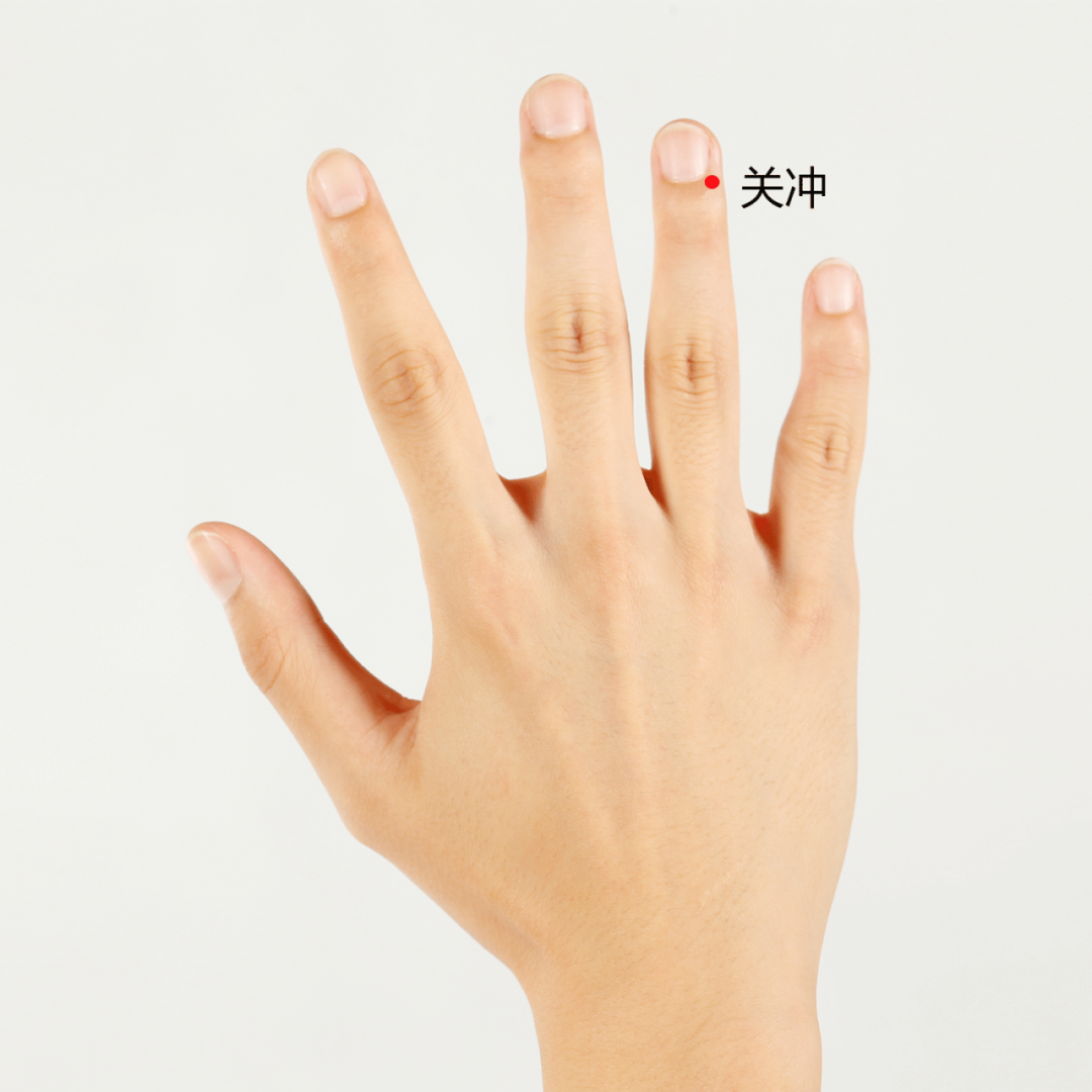 刺激手腕处的内关穴,有益心安神、和胃降逆止呕、宽胸理气的作用。加上虎口处的合谷穴、无名指的关冲穴,能排浊气、镇痛、缓解恶心感。