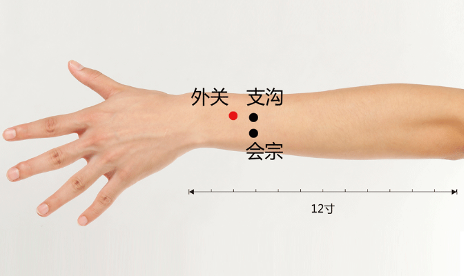外关穴在前臂背侧,当阳池与肘尖的连线上,腕背横纹上2寸,尺骨与桡骨之间。