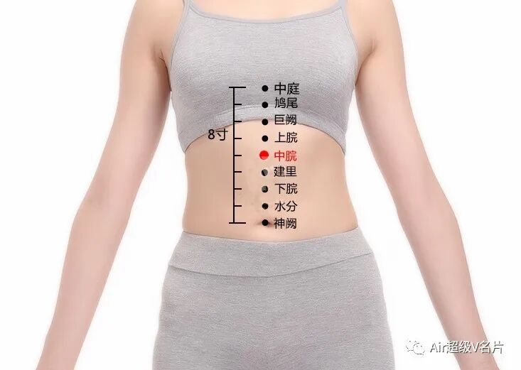 中脘穴在身体正中,肚脐向上4寸处,调理胃寒、胃痛、呕吐、泄泻。用食指和中指并在一起点按1分钟,中脘穴处会有热热的感觉。经常点按,可以调理胃痛,缓解紧张、焦虑。
