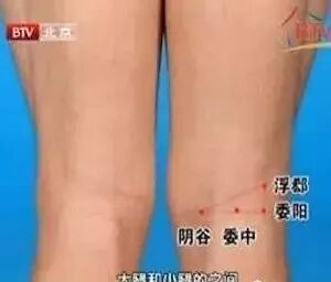 腘横纹内侧有两个肌腱,叫半肌腱 半膜肌肌腱。外侧有一个股二头肌肌腱。这里穴位:阴谷、委阳、委中、浮郗。是足太阳膀胱经和肾经经过的地方。记不住穴位,只要点揉这个三角区。