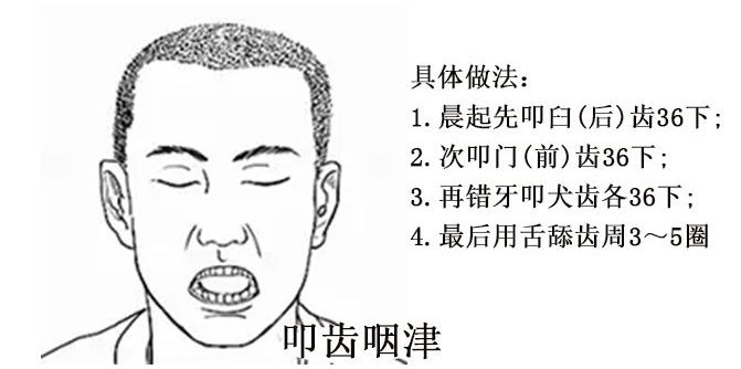 方法是每天早上醒来时,放松全身,仰卧,做咀嚼状,轻轻叩齿60~100次,多则不限(平时在工作、学习时也可随便轻叩),有益于健齿、强身。
