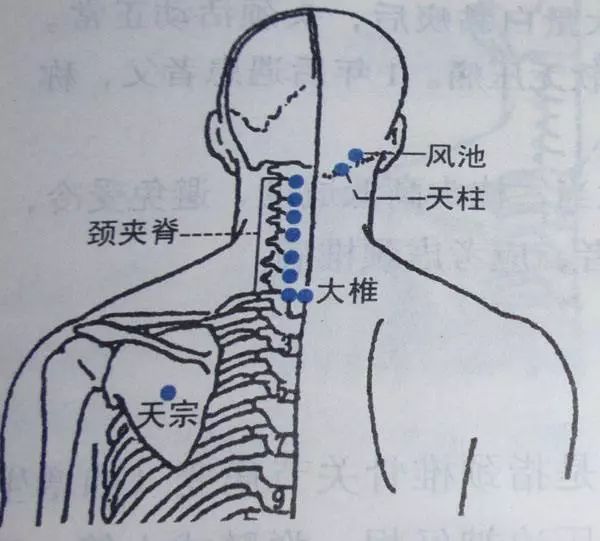 2. 天宗穴、风池穴、天柱穴:肩膀的酸痛扩及背部时,指压天宗穴即可见效。天宗穴是位于肩胛骨正中央的穴道。在肩膀背侧,左右皆有参角形的骨,即肩胛骨。