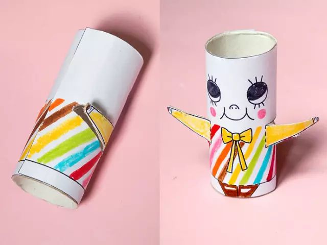 5、人物的头上可以用粘土作为头发,一个纸筒小家族就这样做完了,好可爱啊~