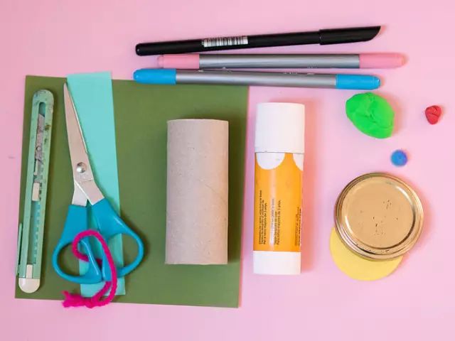准备材料:彩笔、剪刀、美工刀、彩色卡纸、大小合适的瓶盖粘土。