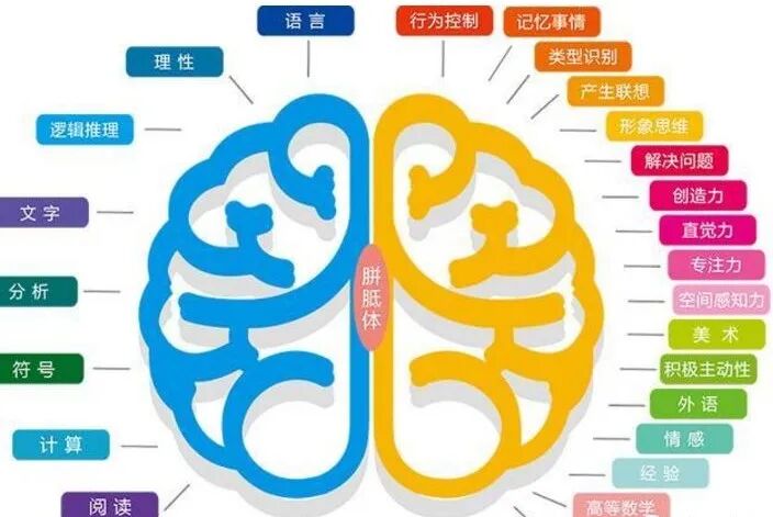 左脑被成为“学术脑”,负责逻辑思维、推理、语言、计算等,而右脑被称为“艺术脑”,负责艺术感知力、专注力、联想、创造力、发散思维等能力。