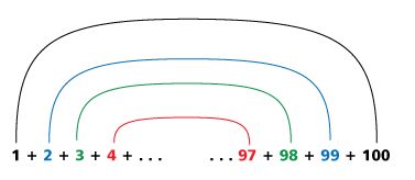 小学生们一般都很顽皮,老师为了让孩子们安静下来,在黑板上写下了一个很难的问题让他们解答:将数字 1 到 100 中的所有数字相加。刚好那天,后来被认为是最伟大的数学家的高斯在那个班上。老师以为孩子们会花很长时间才能解出这个问题,没想到不到一会儿,高斯就开始和他的朋友们说话。老师询问高斯为什么不答题而在课堂上讲话,高斯说他已经解出了这个问题。当班上的其他学生将数字一个一个相加的时候,高斯做了一些不同寻常的事情。他发现,将序列的左边和右边分别相加时,总能得到数字 101。比如:1+100,2+99,3+98,…,50+51,总共有50个101。