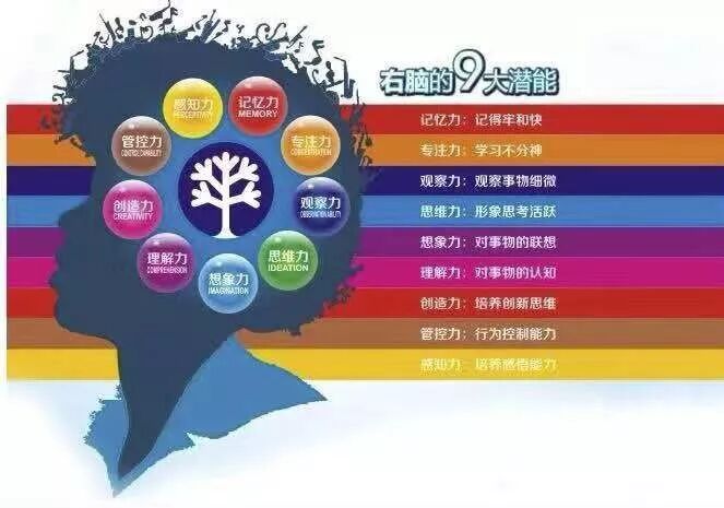 右脑是蕴藏着巨大潜能的区域,是创造力爆发的区域,里面蕴藏着无限可能。它不但有超强的记忆能力又有高速的信息处理能力,右脑发达的人会突然爆发出一个想法、一条思路、一个小小的发明。